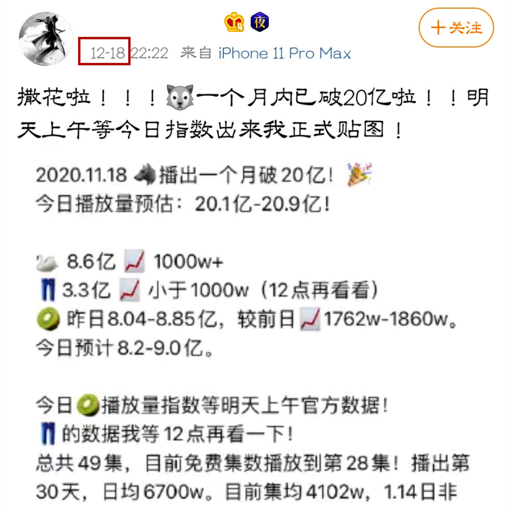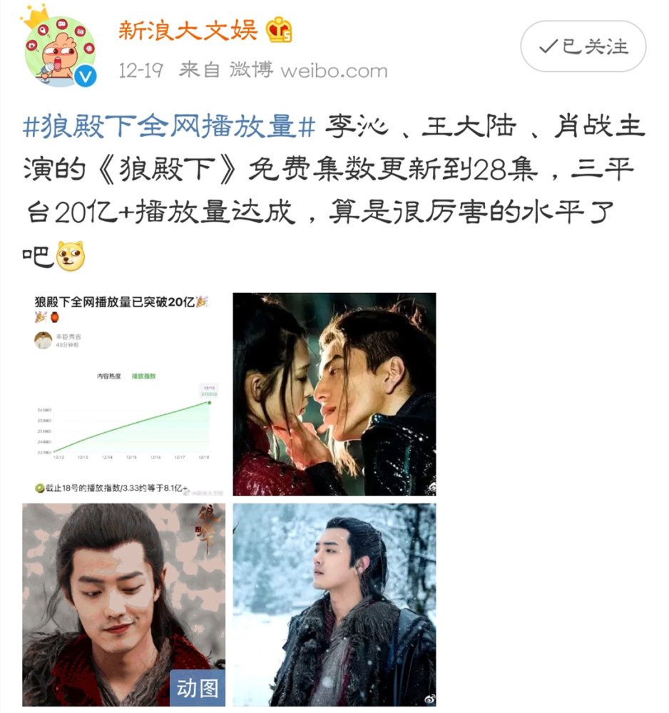 《狼殿下》开播至今已经过了34天,在鹅桃裤三个平台的播放量已经破了20亿的大关,当然这个数据还只是在19号上线一个月的时间统计的整体数据,而现在又过了4天,播放数据依旧是每天在上升,现在恐怕又创造出新的数据了。