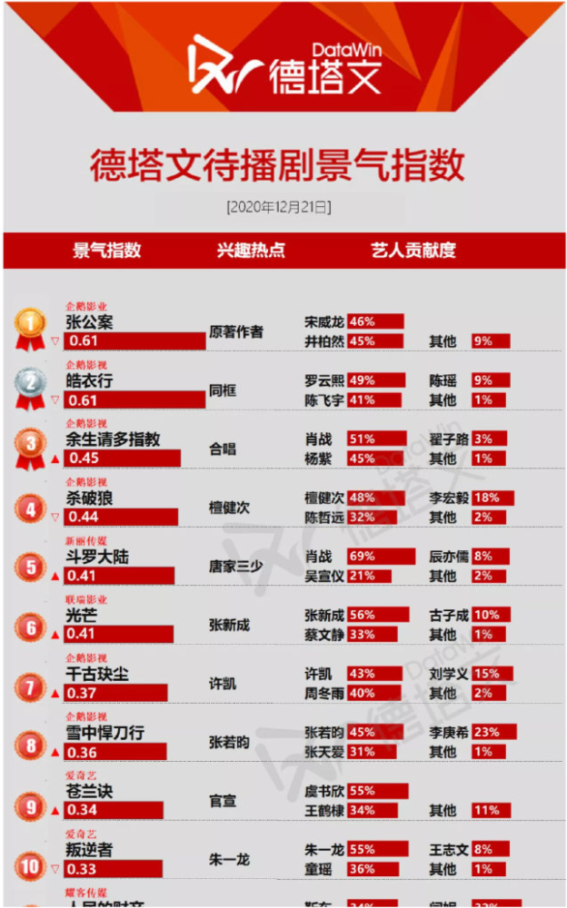根据待播剧景气指数的数据显示:张若昀主演的电视剧《雪中悍刀行》上榜第八,杨紫、肖战主演的《余生请多指教》热度飙升排名第三,第一是持续霸榜的《张公案》。