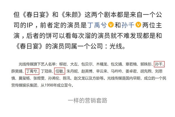 《春日宴》从一开始的丁禹兮、张予曦、赵露思等人,到目前似乎已经确定了是丁禹兮和孙千。而孙千是光线的一位新人演员,这两部剧恰巧都是光线出品,任敏也是这家公司旗下艺人,这样一说应该大概都可以明白了。