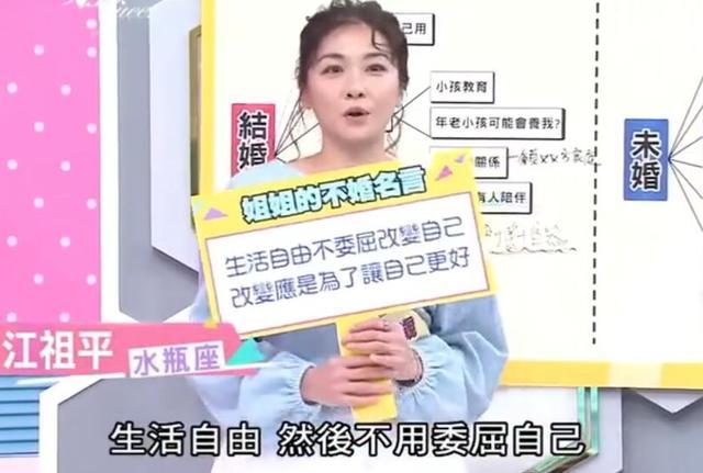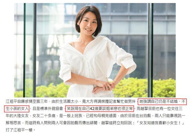 虽然坚持不婚主义,但42岁的江祖平依然向往爱情。20177月,江祖平现身新剧宣传活动,表示她已经单身3年,与她年龄相仿的单身男性已经所剩不多,因此不介怀再谈姐弟恋。