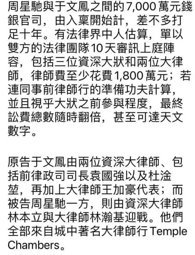 两人在私下调解无果,最终只能对簿公堂,吸引了不少吃瓜群众的关注,此次于文凤败诉后,她不但要支付自己一方的律师费,同时也要支付周星驰那边的所有诉讼费,双方的法律团队在10天审讯上共派出了几位资深大律师。仅仅是律师费就要花1,800万元港币,再加上律师团队在时间需要做很多功夫,总费用可以达到半亿港币了,现在案子已经结案,愿两位各自安好吧!