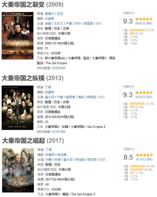《大秦帝国》系列前三部,从秦孝公即位、重用商鞅进行变法、使秦国由弱转强开始,一向演绎到秦昭襄王纳九鼎这绵延一百多年的历史。三部曲的评价都很高,《裂变》和《纵横》都得到9.3的高分,《崛起》也有8.5分。说《大秦帝国》系列是国产历史正剧的巅峰级作品,毫不为过。