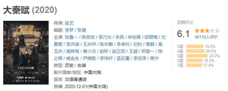 然而随着时间的推移,战争场面依旧声势浩大,服饰道具依旧高度还原,演员演技依旧炸裂......什么都没有变,惟一变了的,就是剧集的豆瓣分数。现在《大秦赋》的实时评分已经是6.1分,并且还在持续的断崖式下滑中。