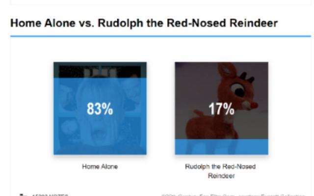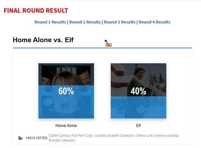 据悉,《小鬼当家》的夺冠经过了五轮的观众票选,其中,《小鬼当家》以83%的上风压倒1964年上映的《红鼻子驯鹿鲁道夫》,以同样的上风压倒1994年上映的《圣诞老人》。