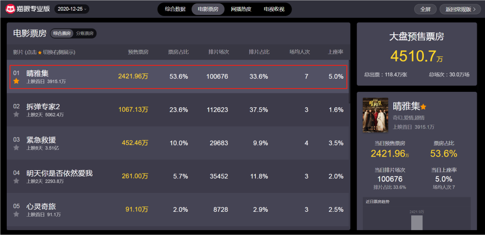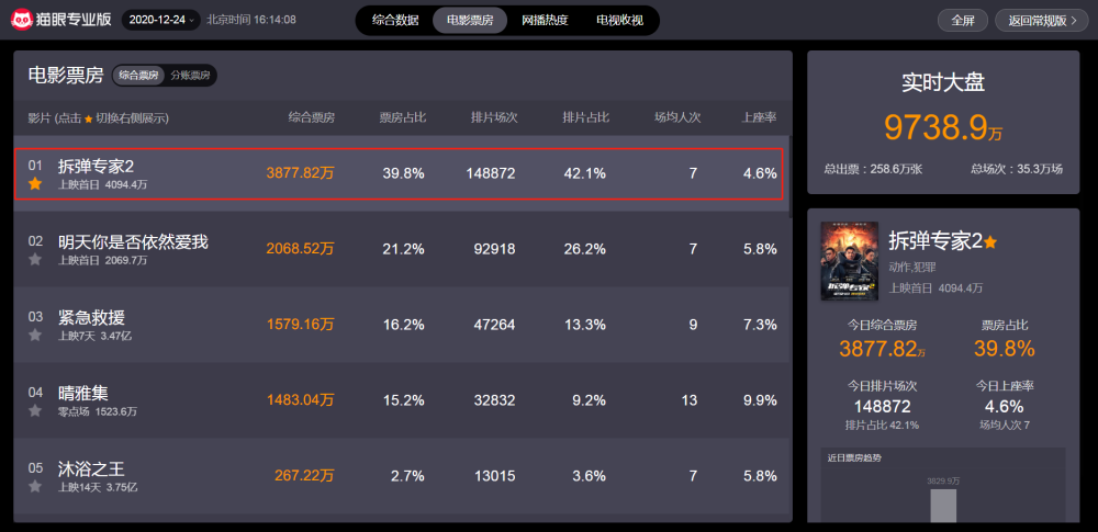 从“猫眼专业版”实时票房数据显示可知,在影片上映首日(12月25日),该片目前预售总票房已经突破2400万,且排片场次和《拆弹专家2》仅差一万余场,如果口碑还行,估计各大影院排片场次还会有所上涨。