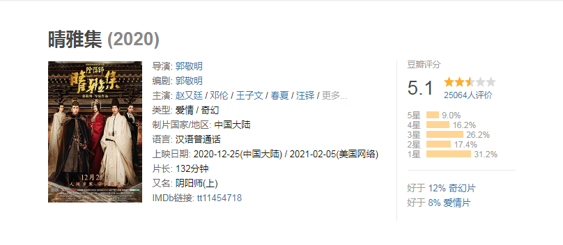 自从《晴雅集》官宣以来,就因为郭敬明的缘故一向招黑!今天才刚刚上映,豆瓣评分就出来了,目前只有5.1分,打一星的占比31.2%。但是出乎意料,首日上映还没有结束,可以说,目前才进行了一半,而票房已经达到了8400多万,昨天上映的《拆弹专家2》目前票房才1.26亿,按照这个势头,《晴雅集》的票房即将要超过《拆弹专家2》了!