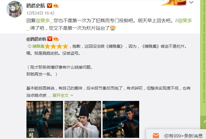 而今天早上,看到史航在微博发布一条消息,首要讲的就是《晴雅集》肯定不是烂片,没法喷了,并强调没有盗号!