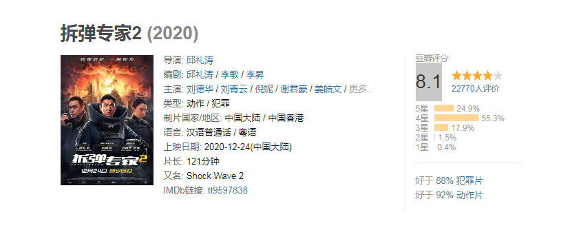 《拆弹专家2》无论是口碑还是票房都表现得不错,大部分的评论都表示第二部比第一部精彩!第二天票房就过亿的票房表现也是可观的!豆瓣评分更是高达8.1分,可以说是求名求利,和《拆弹专家2》差别,《晴雅集》的口碑在没上映之前就烂掉了,评分也是很不悲观!然而首日票房表现却比《拆弹专家2》的首日票房还要好!