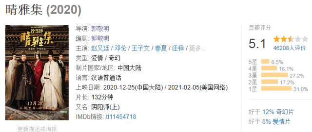 当然,比起郭敬明之前的作品,这部《晴雅集》特效和配乐俱佳,也算是有进步了。但是该片豆瓣仅5.1分,依旧不及格。