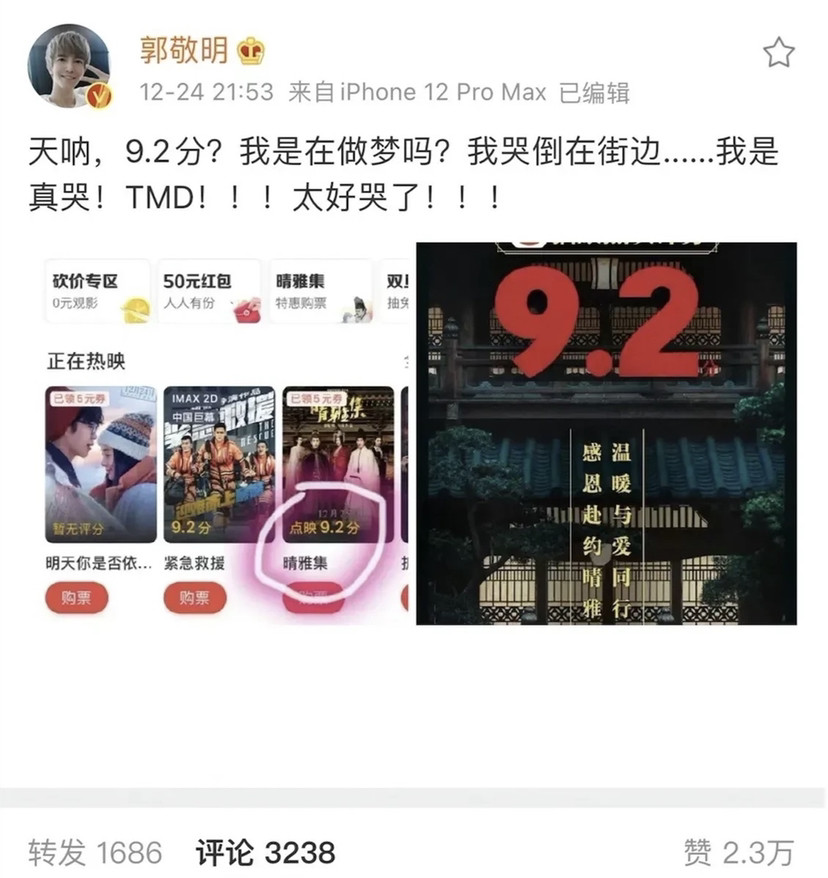 在24日晚影片正式上映前,郭敬明看到某猫9.2的评分时,激动到飙粗口,直言我是否是在做梦?我哭倒在街边……