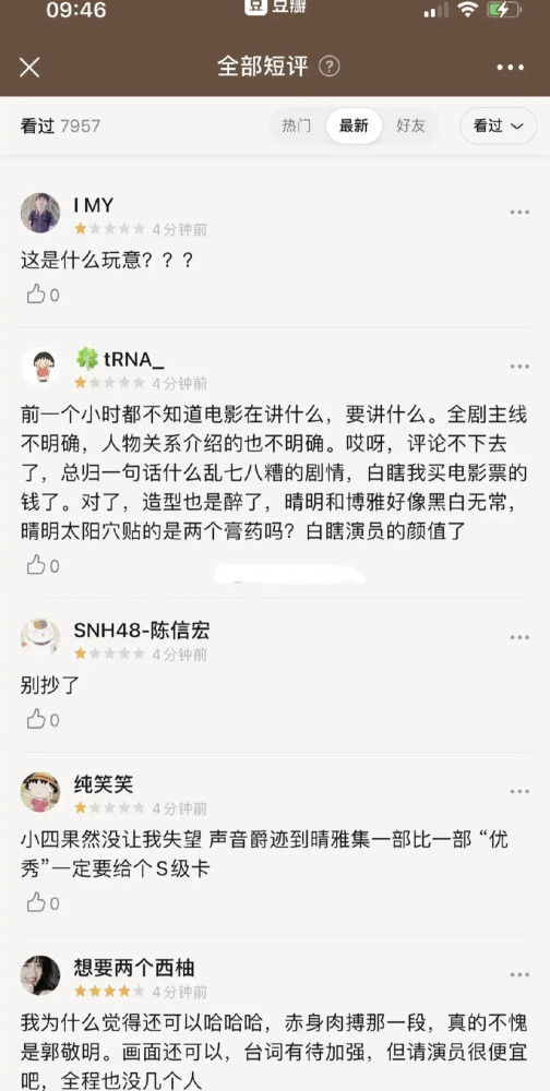 然而第二天,在影评区里都是满满的难看。果然这只是一个梦,四爷醒来还是要接受现实。照这个势头下去,《晴雅集》真的有可能追平郭敬明之前的作品评分,跌到4点几分。