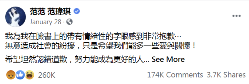 过后范玮琪删除原帖并发文道歉称,为自己带有情绪性的字眼感到抱歉,无意造成纷扰,只是希望能多一些爱与关怀。
