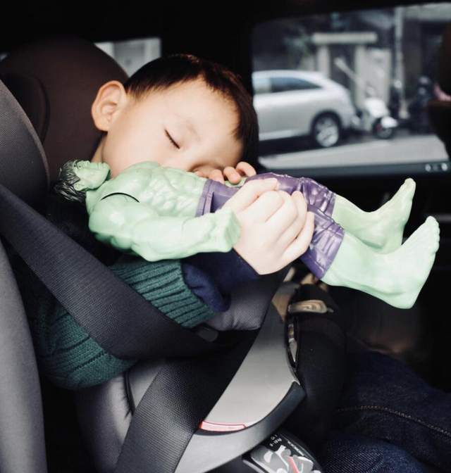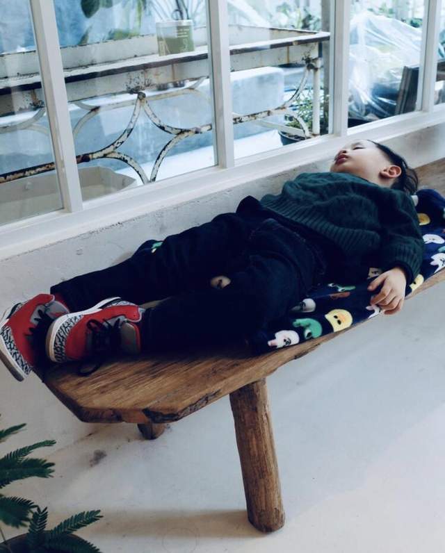 Cody一点儿也不矫情,玩累了,直接睡在长椅上,余文乐夫妇心也挺大,也不怕儿子从长椅上摔下来。