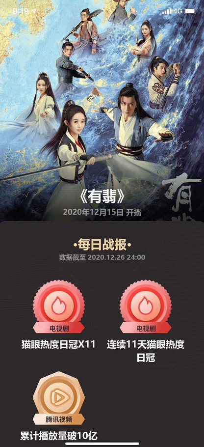 12月16日开播后,连续11天猫-眼全网热度第一,截至目前视频播放量累计突破10亿。