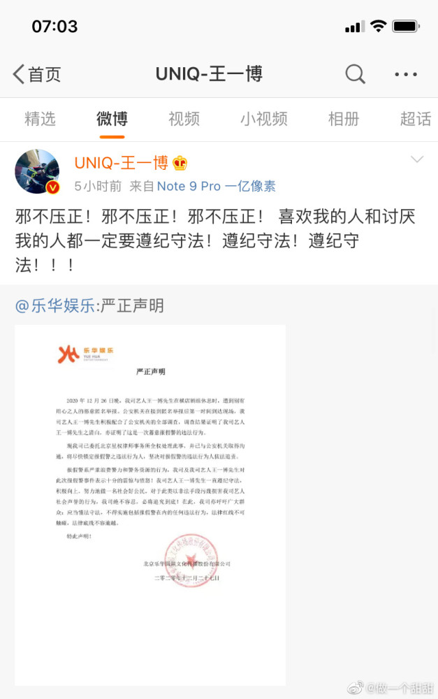 王一博被报假警举报,乐华娱乐发表声明,表示王一博在横店剧组休息时遭到恶意匿名举报,王一博配合公安机关调查,最终证明了王一博的清白,并证明了这是一次蓄意报假警的行为。 王一博转发表示“喜欢我的人和讨厌我的人都必然要遵纪守法”。