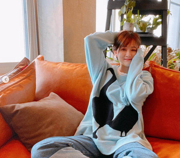 男友视角下的陈乔恩扎着可爱丸子头,少女感十足。她身穿蓝色宽松卫衣搭配牛仔长裤,赤脚坐在沙发上凹造型,双手抱头模样可爱又俏丽。估计是在家里,所以陈乔恩并没有化上浓浓的妆容,清新可人,真是一点都不像是年满41岁的样子,保养得太好了。