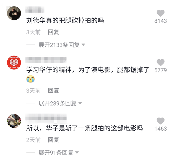 但是,说来也是好笑,由于刘德华在这部电影中,无论是剧照还是片花,全程都是以单脚加上假肢的画面出现,这也导致了很多人不明真相的观众甚至误以为刘德华是真的被“锯腿”了...翻看某社交平台的评论区,网友都是这样留言的: