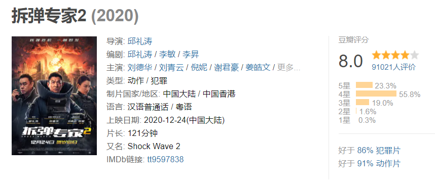 截止稿前,根据最新消息显示,《拆弹专家2》上映四天,总票房已经突破四亿,稳定按照一天一亿的上涨,牢牢占据了每日票房的冠军,同时,《拆弹专家2》的豆瓣评分高达8.0,评分人数超过9万,成为同期口碑最好的国产电影。