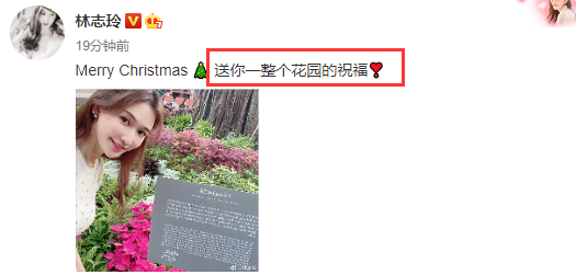 据悉,林志玲婚后一向定居在日本,近日返回台湾,虽然已经是日本人妻,但依然不忘自己的基金会,积极投身公益奇迹,更是前往台南、高雄做公益,并且重返去年与丈夫akira的婚礼举办地台南美术馆,与她自己认养的花园合影,并且开心写下了一段圣诞节祝福:“Merry Christmas~送给你一整个花园的祝福。”
