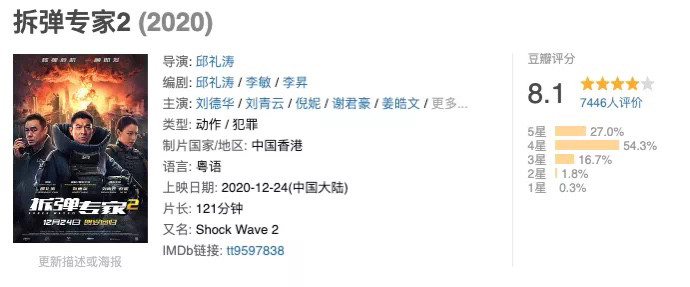 但是,《拆弹2》则进了一步,在满足观众期待以外,将香港电影的三个长处发挥到了一个极致,让观众在121分钟过后足以感觉收获满满,愿意走出影院给影片打上一个高分,成了一部带动档期大盘的热门影片。