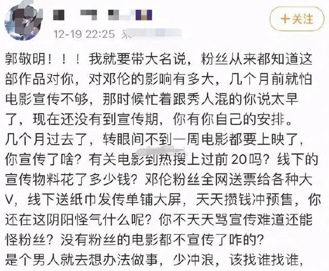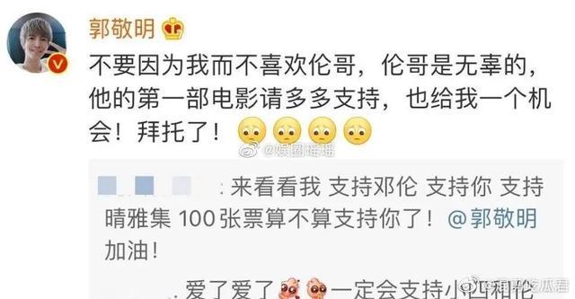 此前,郭敬明还在社交平台称,“不要因为我而不喜欢伦哥,伦哥是无辜的,他的第一部电影请多多支持,也给我一个机会,拜托了!”