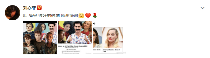 近日,据外媒,英国电影网站Digital Spy公布2020读者大奖获奖名单,刘亦菲获得最佳女演员,其主演的《花木兰》斩获最佳电影。随后刘亦菲录制视频发布获奖感言,并在微博晒出获奖截图,写道:“哇,高兴,很好的鼓励,感谢感谢。”
