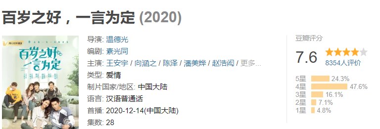 这部剧厉害了,原本大家都不看好《百岁之好,说一是一》,可这部剧愣是凭借甜宠、紧凑剧情圈粉无数,而且目前口碑评分已经达到了7.6分,也就是说,《百岁之好,说一是一》跟《阳光之下》有的一拼呢!