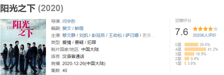 但《阳光之下》作品算是有点高开低走,尽管剧中有很多名场面是还原了,但封潇声跟柯滢之间的对手戏太少,观众都直呼但是瘾呢。加上原著粉丝要求有点高,而如今电视剧的名字跟主角名字都变化了,从而导致评分已经降落到7.6分,看来《阳光之下》还是有点悬呀!