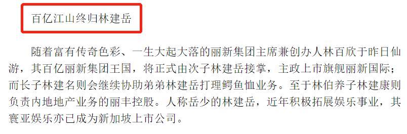 林百欣一共有育有七名子女,并另外收养了一位养子。但在2005年,林百欣去世后却将大部分的遗产留给了林建岳,如今继承遗产的林建岳也成为了百亿富豪。
