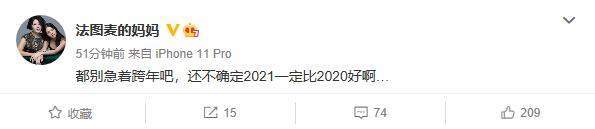 然而几家欢喜几家愁,家家都有本难念的经,不是所有人都渴望跨年,甚至有的带有十分消极的情绪,去反对新年的到来,比如说已故央视著名主持人李咏的妻子哈文,在12月30日一大早,便通过微博发文给所有人泼了一盆冷水:“都别急着跨年吧,还不确定2021必然比2020好啊。”