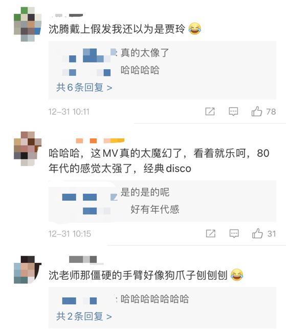 MV发出以后,引起了网友们的热议。有网友说他以为沈腾戴上假发以为是贾玲,还有网友回复说真的太像了,很有年代感。也有网友说MV太魔幻了,看着就乐呵,是经典的disco。还有网友评论说沈腾僵硬的手臂看起来很像狗爪子在刨,完全不违和,形容的非常生动形象。