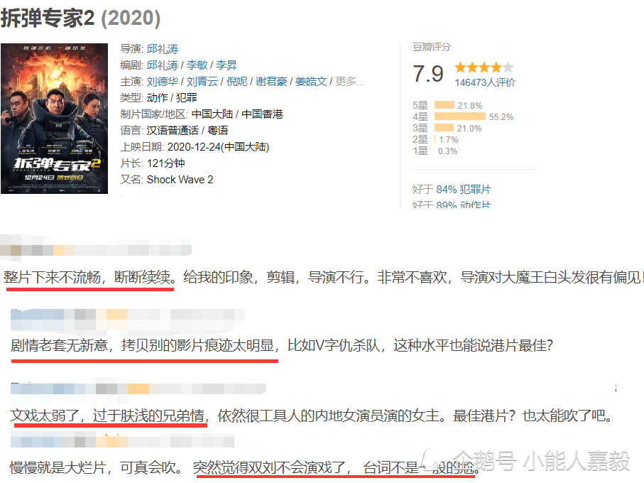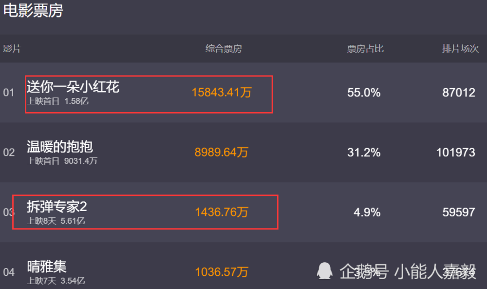 相比较之下这样煽情为主的《送你一朵小红花》要比《拆弹专家2》更具票房号召力的优势,毕竟主角是当红的新星易烊千玺不缺粉丝追捧的热度,再者演员的演技不得人心就连岳云鹏的都是难得的深受观众认可,占据了“人和”又选择元旦小长假上映有了“天时”电影优势尽在怎能不火,而《拆弹专家2》已经过了第一波的热度,想要再次出现票房井喷的强势已经是难上加难。