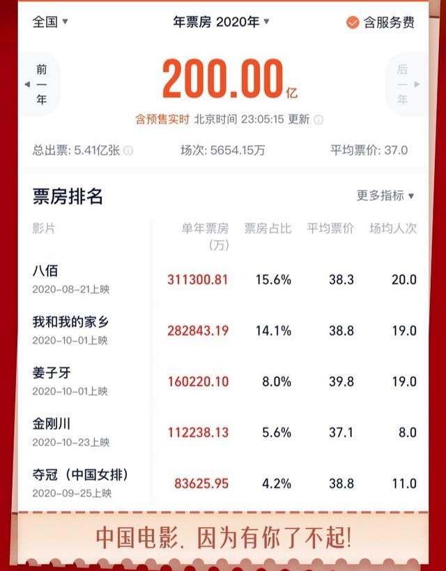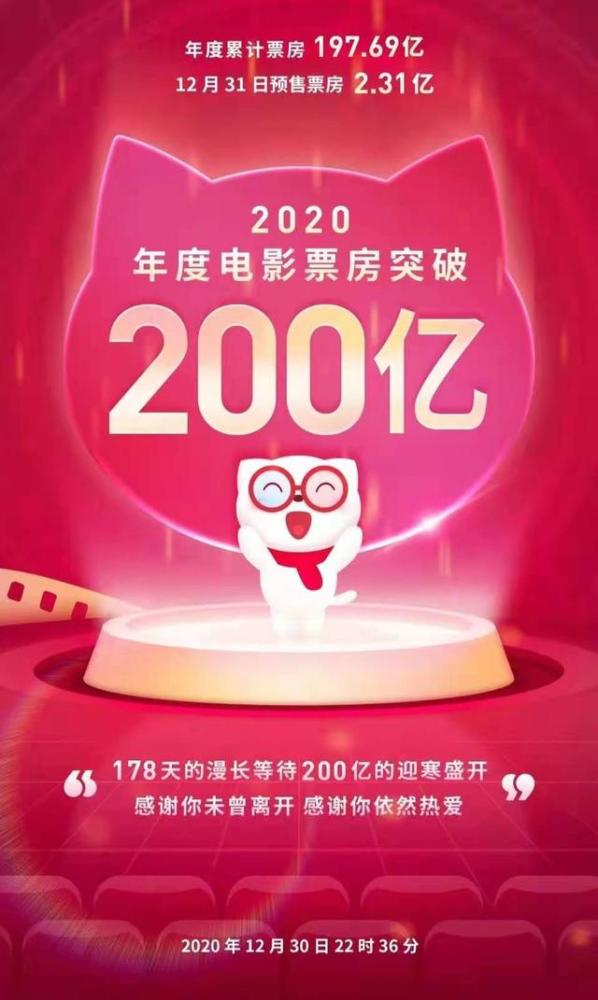 截至12月30日晚上,据猫眼专业版数据显示,12月30日22时36分,中国电影2020年度票房突破200亿元,其中包含31日《送你一朵小红花》《温暖的抱抱》等影片的预售票房。