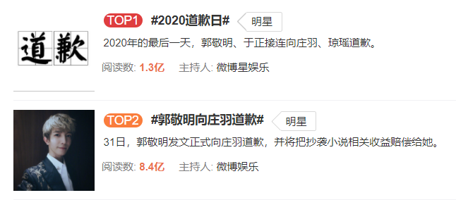 2020年12月31日凌点整,郭敬明终于发微博就自己所著《梦里花落知多少》一书系抄袭作家庄羽小说《圈里圈外》正式向庄羽道歉,表示后悔在法院判决后不愿承认错误:“庄羽女士,对您酿成的伤害,我郑重道歉,非常对不起。”同时,他也向所有原创作者们和创作环境道歉,“对不起,我做了非常欠好的示范,请大家以我为戒,拒绝抄袭,尊重创作。”