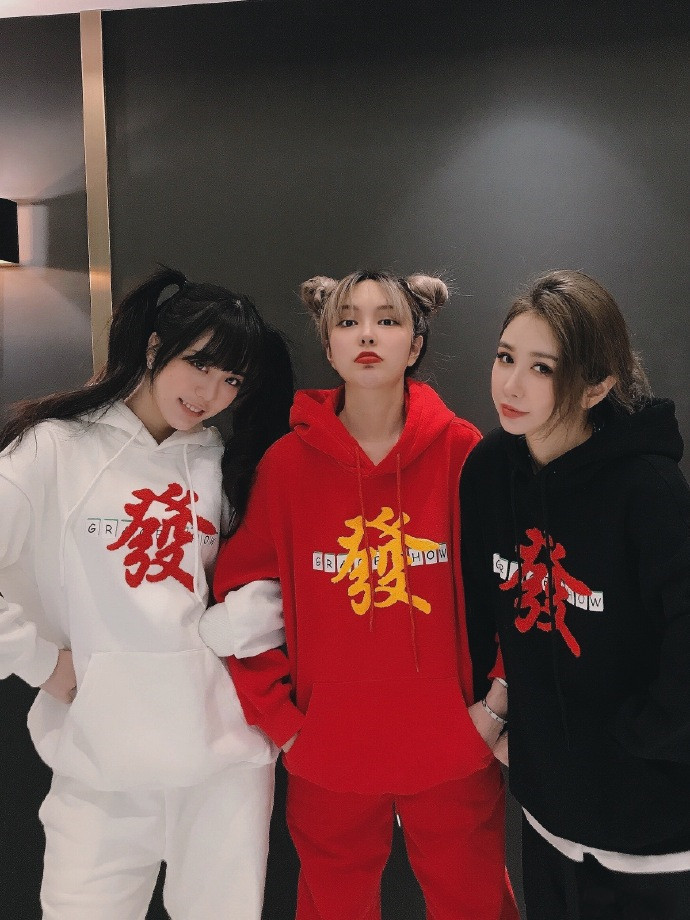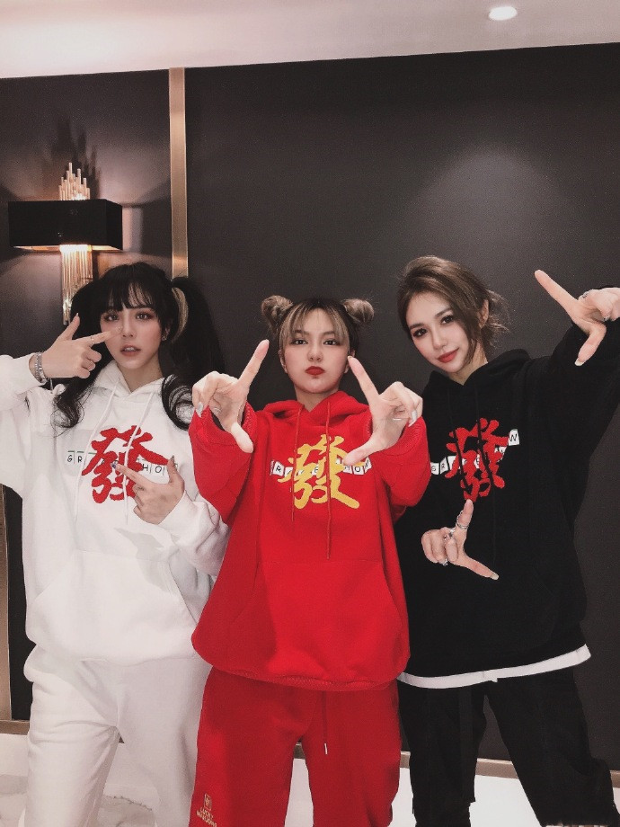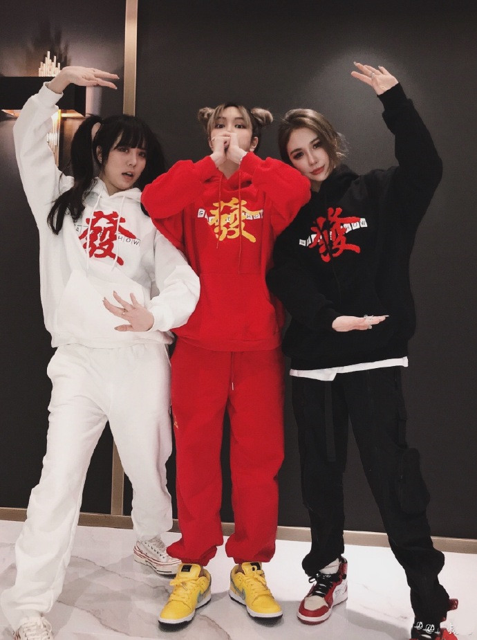 照片中,周扬青扎着双丸子头,身穿喜气洋洋的红色卫衣套装站在C位做出恭喜手势,可可爱爱的模样十足的美少女既视感。身旁的两位漂亮小姐姐则穿着一身白和一身黑,三人的闺蜜装超抢镜,再配上同款手势,真是小细节都是满满的姐妹情深,羡煞旁人。