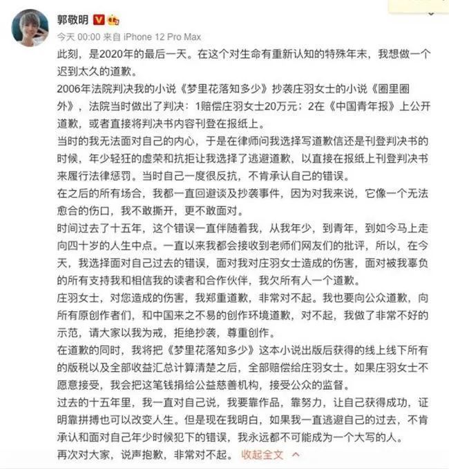 就在网友议论不休之际,郭敬明突然向曾经抄袭的作家庄羽公开道歉,整篇微博情真意切,字字泣血,再次令全网沸腾。