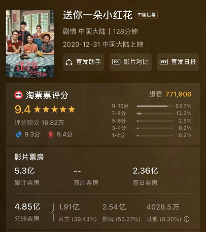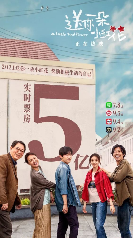 2020年12月31日,由易烊千玺主演的电影《送你一朵小红花》在当天晚上6点正式上映。截止2021年1月2日上午9点,这部电影的累计票房已突破5亿元,淘票票评分高达9.4分,豆瓣评分则为7.7。