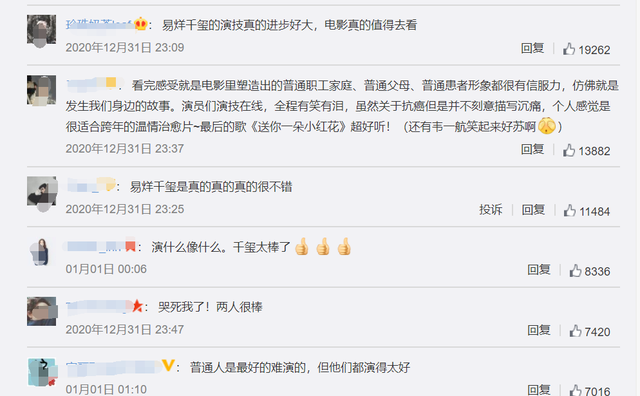 而在影片上映后,易烊千玺的表演再次获得一致认可,又进一步拉高了票房。易烊千玺在该片中饰演的韦一航,是一个承受着癌症随时复发煎熬的男孩,他想要摆脱病痛桎梏,身体却困顿于现实。有观众认为易烊千玺的表现细腻,完全演出了癌症病人的特点。甚至有人认为,易烊千玺是否是身边有人曾身患癌症,或者他对癌症病人进行了非常细致的观察。