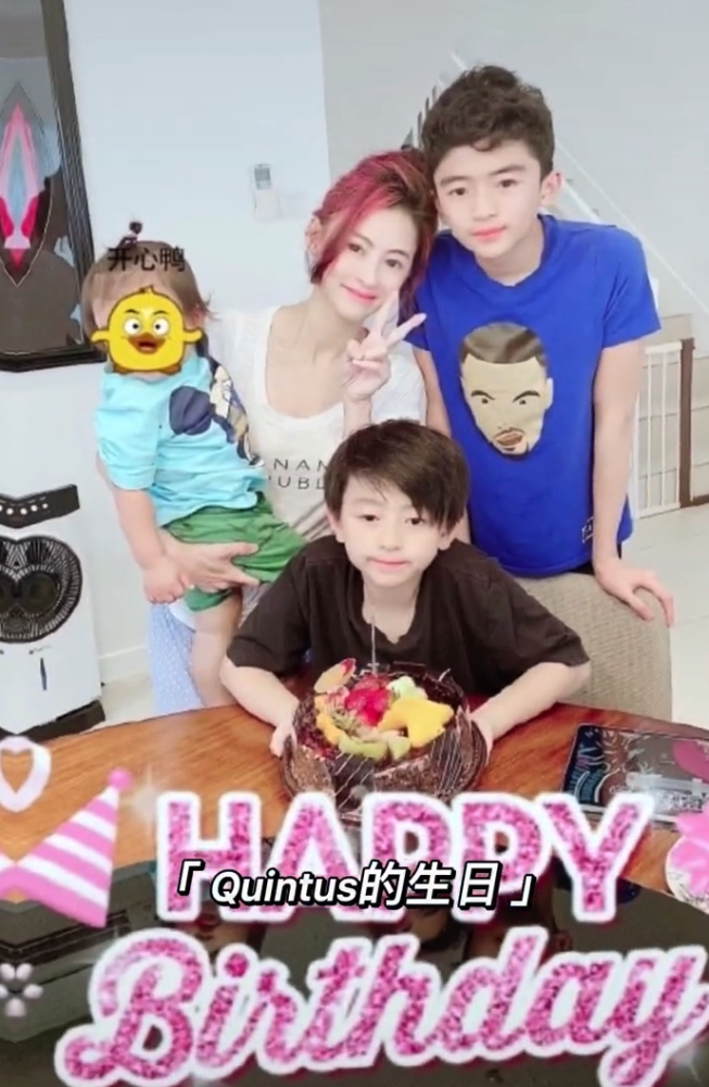 这张照片拍摄于二儿子Quintus生日当天,2岁的小儿子被张柏芝抱在怀里,虽然正脸被贴纸遮挡,但能看出小家伙长得非常快,胖乎乎的很健康。