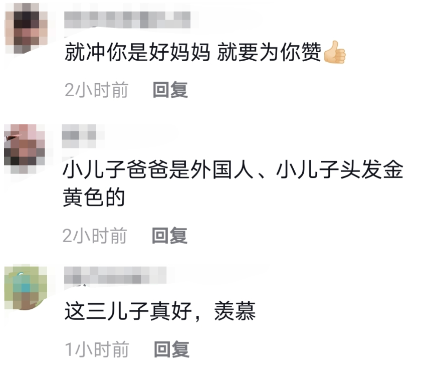 网友们也纷纷在评论区里留言猜测小儿子的爸爸应该是外国人,虽然张柏芝至今没有公布三儿子的生父身份,但能看出她自己一小我也将三个小家伙照顾得很好,是个当之无愧的好妈妈。