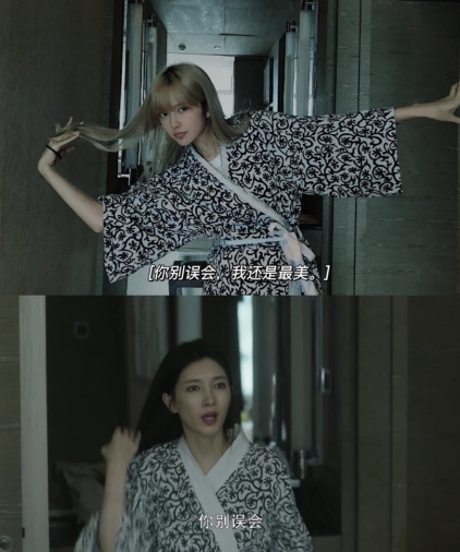 周扬青还特意穿上了王漫妮同款睡袍打卡纪念。