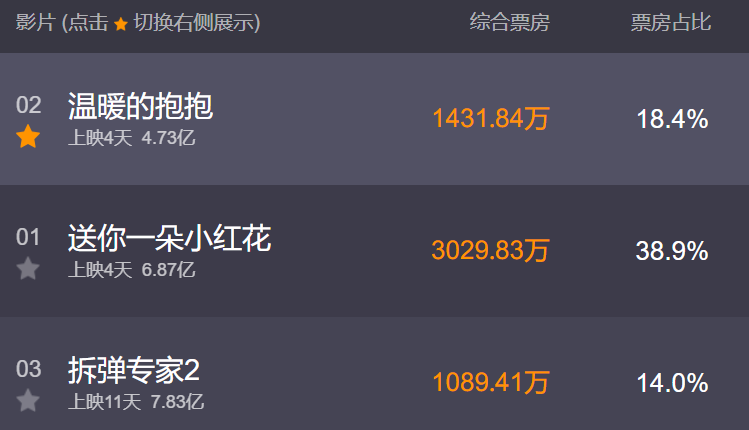 《温暖的抱抱》票房目前落后《送你一朵小红花》两亿多,但是从上升趋势来看,突破5亿是没有问题的。