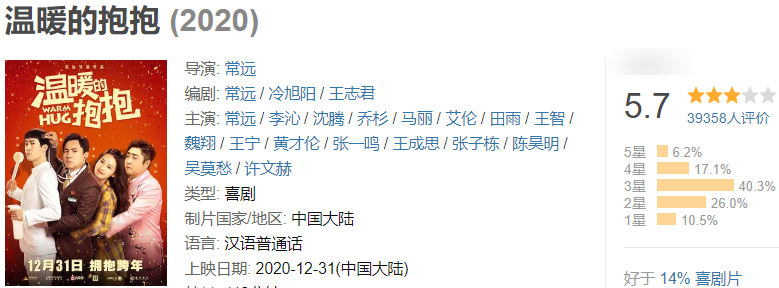 在整体评分上,《温暖的抱抱》只有5.7分,这个评分在中国电影圈代表着什么呢?那就是进入电影院看电影的时候,马上就会被吸引到,然后全程都在哈哈大笑。