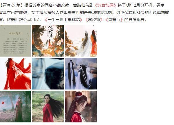 而这个好消息其实就是之前溜粉了很长一段时间的《沉香如屑》,网传这部仙侠大剧即将在明年2月份正式开机,而且据爆料男女主人选也已经确定好了,且是与之前网传的人选其实差不多。