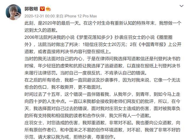 众所周知,前不久郭敬明公开向庄羽女士道歉,很多网友一时间不知道具体发生了什么事情,实际上郭敬明早在15年前就因为抄袭别人作品而被起诉,当时被判罚款、公开道歉,然而15年过去了,郭敬明一向没有为当年的抄袭行为公开道歉,随着互联网记忆被冲散,原本以为大家都忘记这事儿了,没想到郭敬明竟然自动道歉。