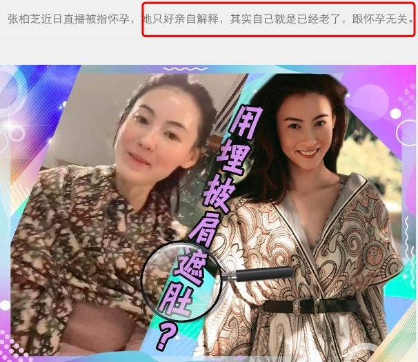 在近日的直播中,张柏芝因为出镜时小腹凸起、穿着宽松,不但全程只露出了上半身,而且还用手不寒而栗地扶着肚子,身上裹着围巾也被猜测是否是用来掩盖怀四胎的孕肚,一时之间'张柏芝怀四胎'的新闻传遍网络。