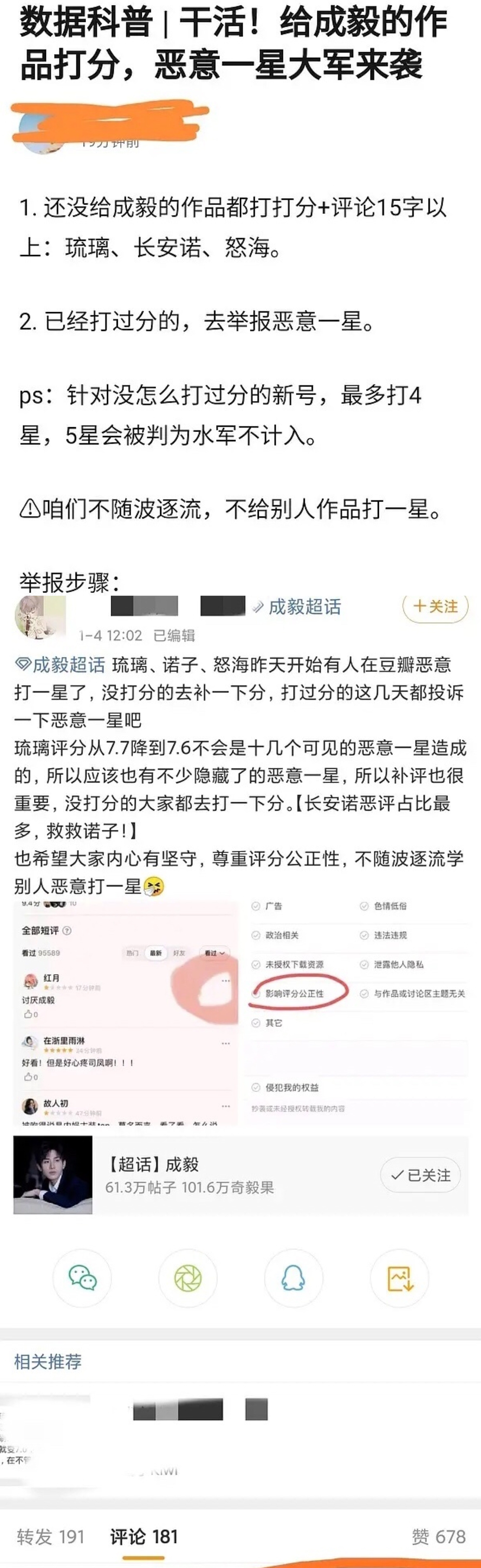 近日有网友发现王一博粉丝开始给成毅出演的多部电视剧作品批量恶意打一星,引发网友热议,这种手段在王一博方也是习以为常的工作,只要发生摩擦,就会给对家艺人作品恶意一星,但成毅粉丝的态度在这种氛围中显得非常珍贵,引导粉丝不同流合污,还表示希望大家内心有坚守,尊重评分公正性,这让很多路人对成毅以及粉丝都充满了好感。