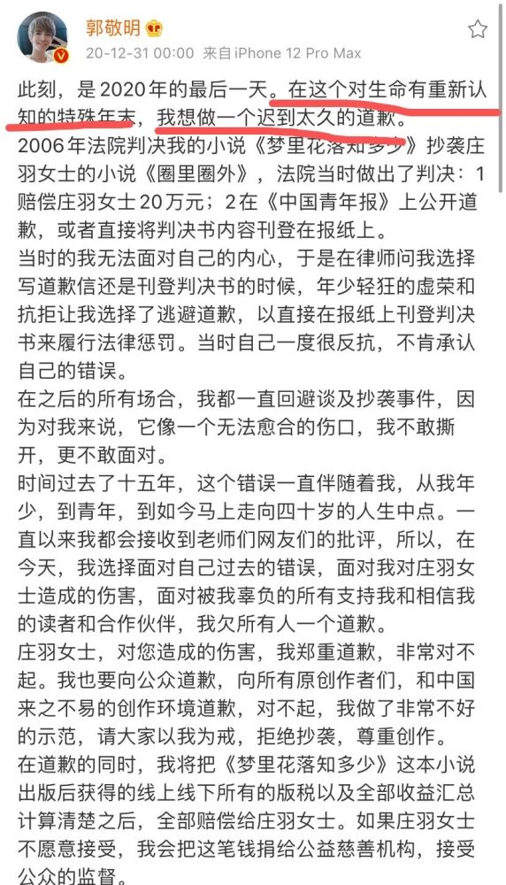 12月31号,郭敬明在微博上公开道歉。关于15年前的《梦里花落知多少》抄袭《圈里圈外》。