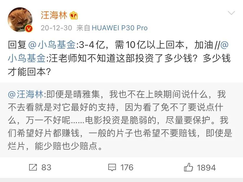 编剧汪海林曾在微博上回网友,《晴雅集》的制作成本约在3亿-4亿,票房需要10亿以上才能回本。