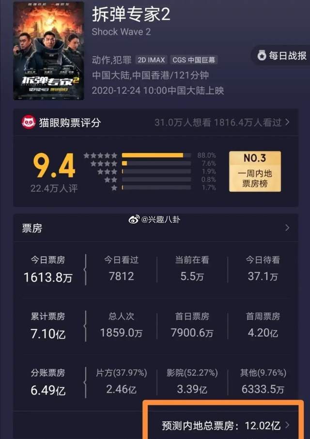 这个速度当然和《送你一朵小红花》不行相比,但作为元旦档唯逐一部评分超过8分的电影作品,至少口碑《拆弹专家2》还是最受观众认可的(《送你一朵小红花》评分7.6)。
